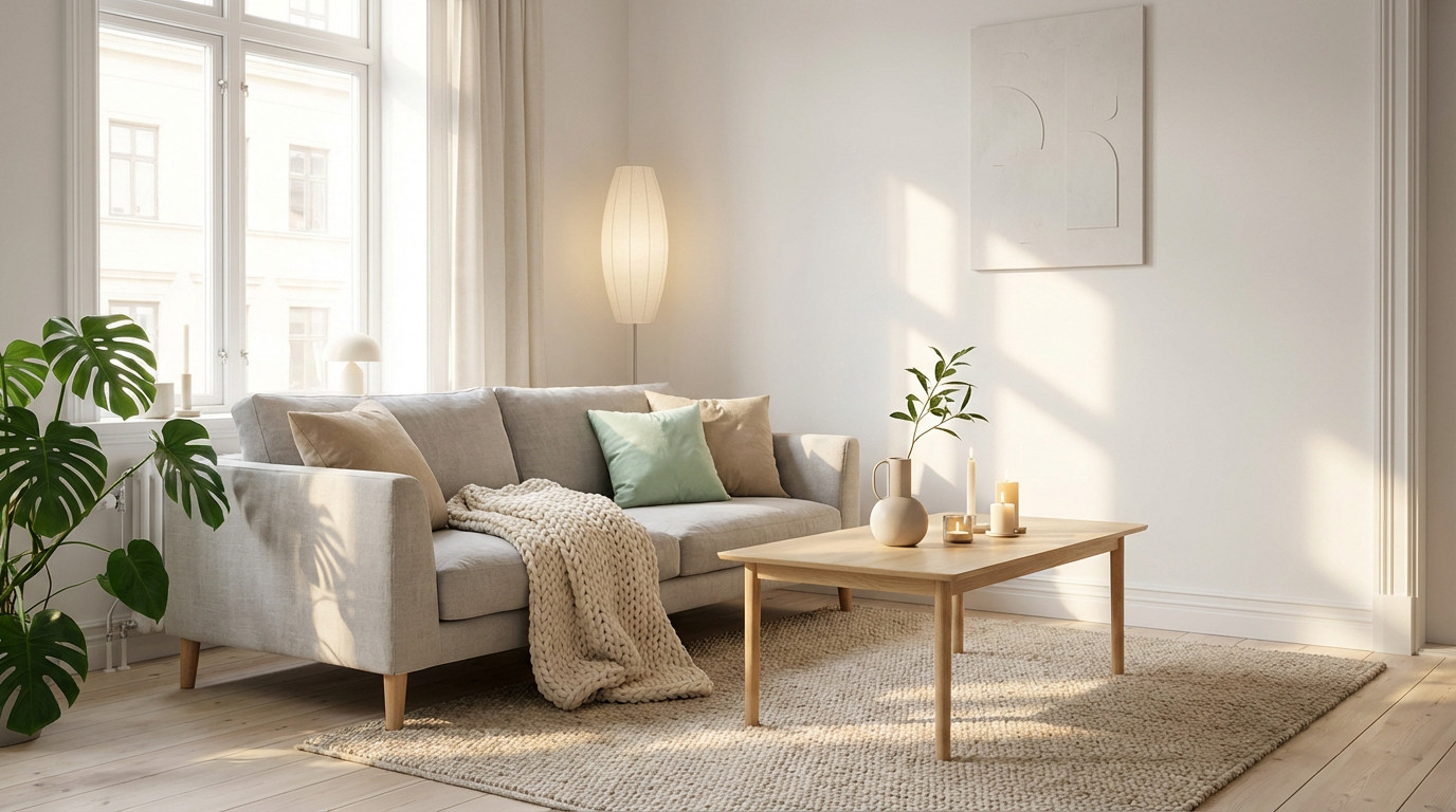 Pour réussir votre déco scandinave, le salon est le cœur du Hygge. Le canapé doit être invitant, noyé sous des coussins et un plaid en laine brute.